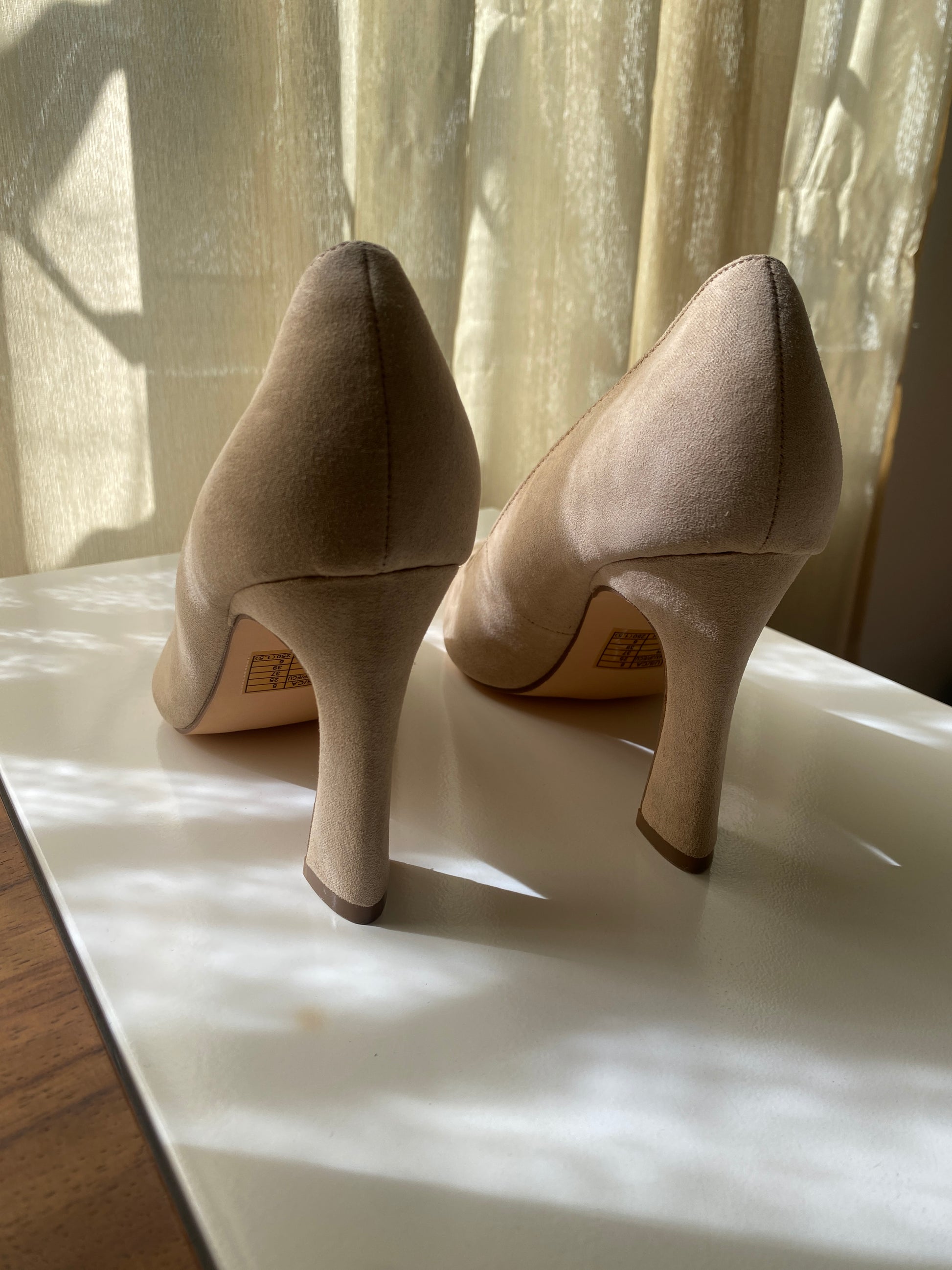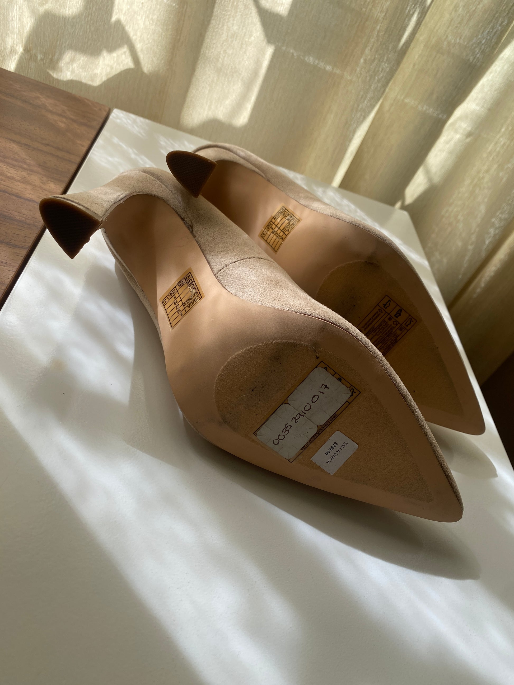 Zapatos de tacón beige, acabado suede, Talla 8USA, 25Mx